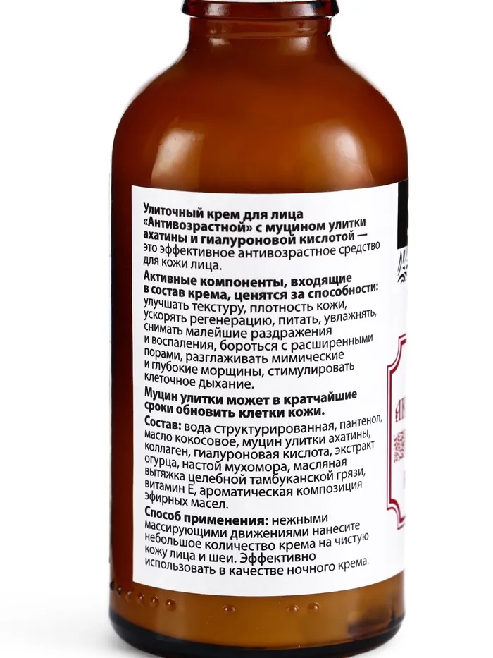 Улиточный крем для лица «Антивозрастной» с муцином улитки — это эффективное антивозрастное средство для кожи лица. Активные компоненты, входящие в состав крема, ценятся за способности: улучшать текстуру, плотность кожи, ускорять регенерацию, питать, увлажнять, снимать малейшие раздражения и воспаления, бороться с расширенными порами, разглаживать мимические и глубокие морщины, стимулировать клеточное дыхание. Муцин улитки может в кротчайшие сроки обновить клетки кожи, наполнить их влагой изнутри, подтянуть овал лица, устранить пигментацию, поддерживая на оптимальном уровне естественный рН-баланс кожи и защищая от токсинов и свободных радикалов.