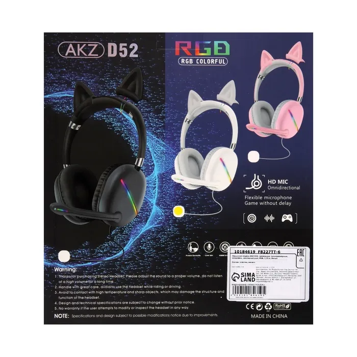 Наушники AKZ D52, проводные, полноразмерные, микрофон, накладные уши, RGB, 1,75 м, белые — Характеристики