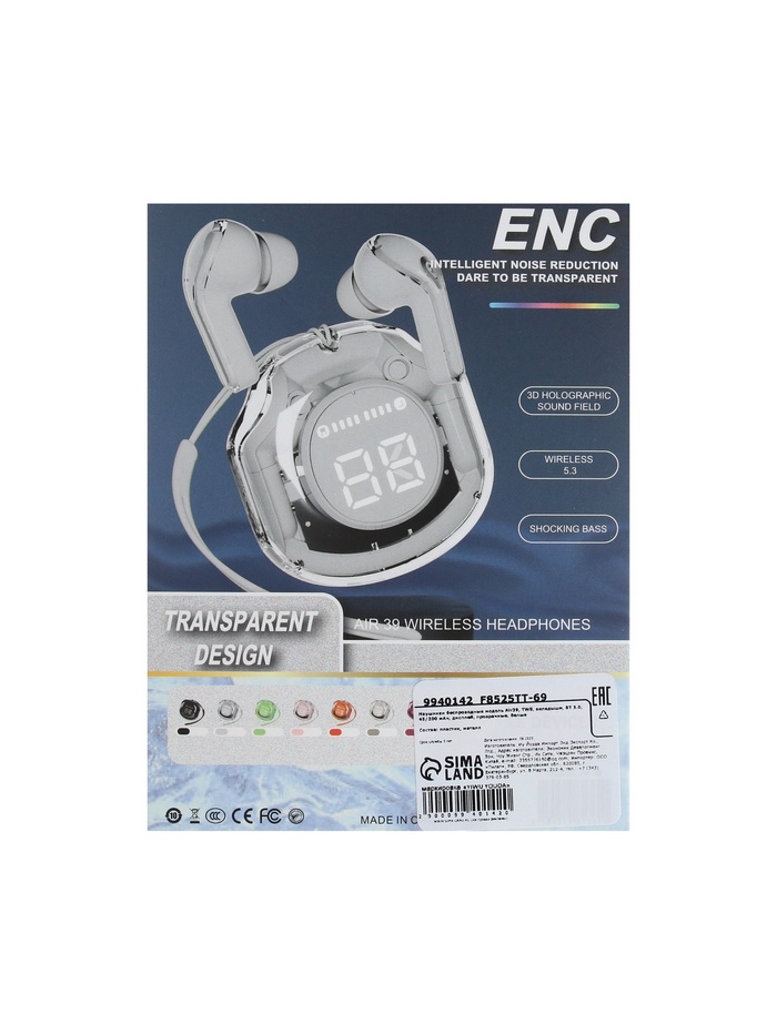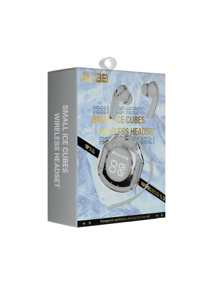 Наушники беспроводные Air39, TWS, вакуумные, Bluetooth 5.0, 45/200 мАч, с дисплеем, белые в прозрачном кейсе — Характеристики
