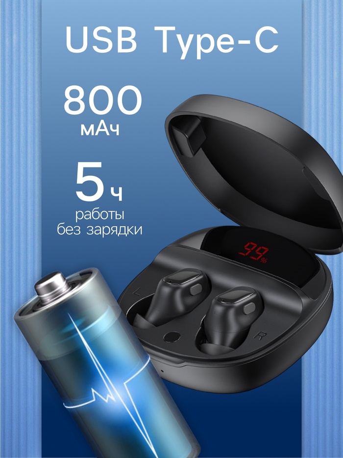 Каждый наушник оснащён аккумулятором ёмкостью 40 мАч, что обеспечивает до 5 часов непрерывного прослушивания. Вместе с компактным зарядным кейсом на 800 мАч, вы получаете до 25 часов работы без подзарядки. Кейс оснащён разъёмом USB Type-C для удобной зарядки.