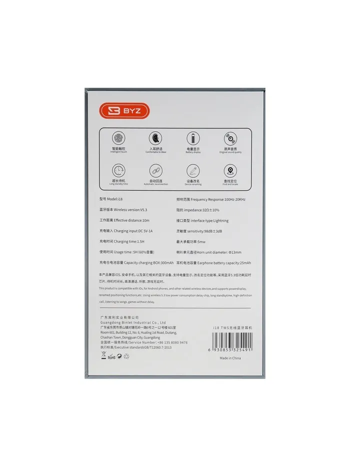 Наушники беспроводные BYZ i18 Youth version, TWS, вкладыши, микрофон, Bluetooth 5.0, 300 мАч, белые — Характеристики