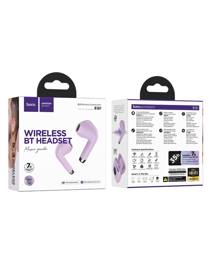 Наушники беспроводные Hoco EQ1, TWS, вкладыши, Bluetooth 5.3, 40/400 мАч, с дисплеем, фиолетовые — Характеристики