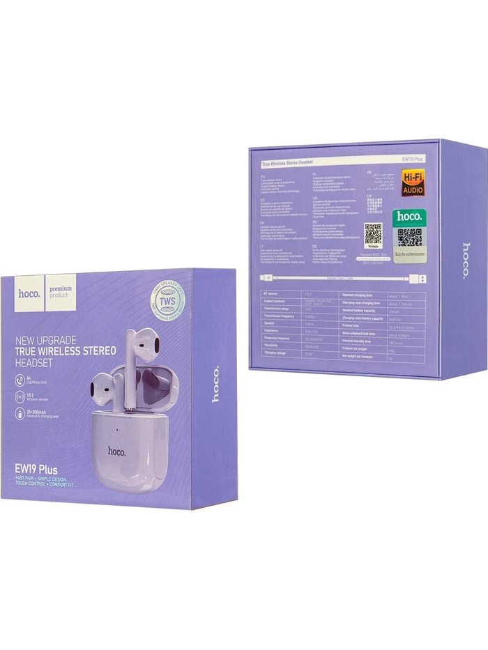 Наушники беспроводные Hoco EW19, TWS, вкладыши, Bluetooth 5.3, 25/300 мАч, фиолетовые — Характеристики