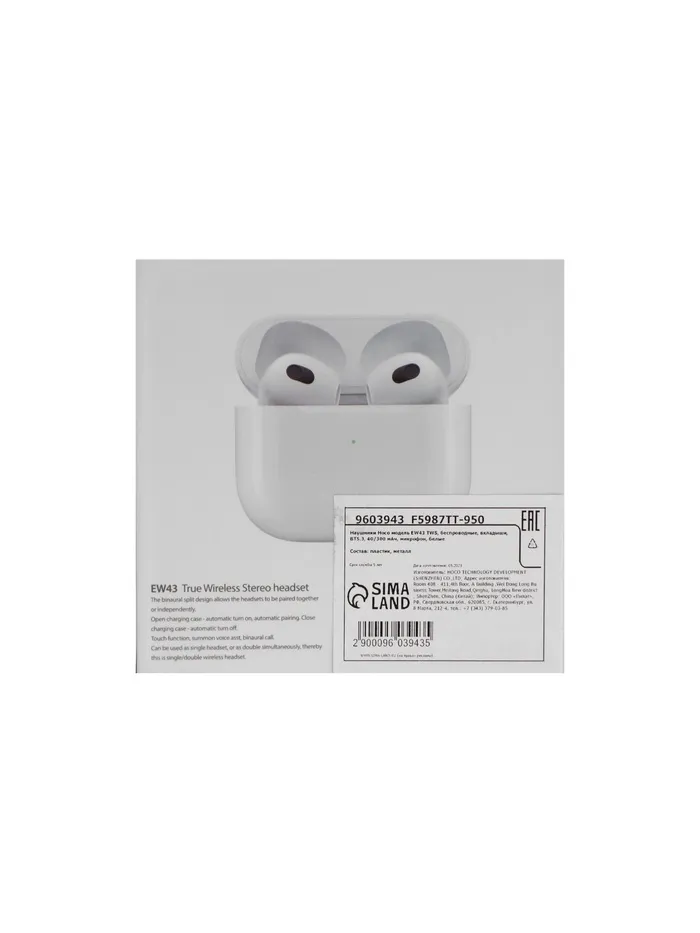 Наушники беспроводные Hoco EW43, TWS, вкладыши, Bluetooth 5.3, 40/300 мАч, белые — Характеристики