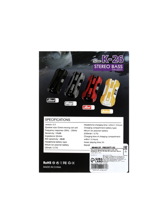 Наушники беспроводные K26, TWS, вкладыши, Bluetooth 5.0, 35/260 мАч, с дисплеем, чёрные — Характеристики