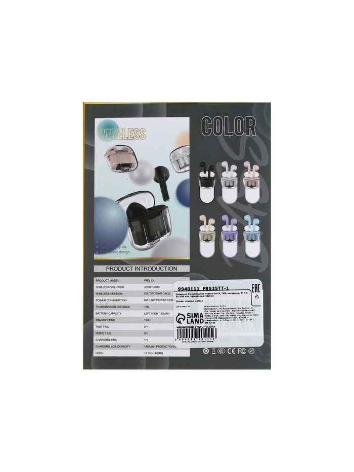 Наушники беспроводные Mybit Pro13, TWS, вкладыши, Bluetooth 5.0, 30/180 мАч, чёрные в прозрачном кейсе — Характеристики