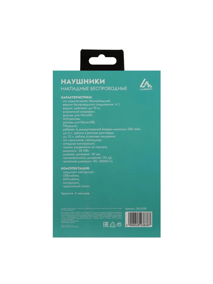 Наушники беспроводные, накладные, Luazon OBT 1.0, с микрофоном, Jack 3.5 мм microUSB, microSD, МИКС — Характеристики