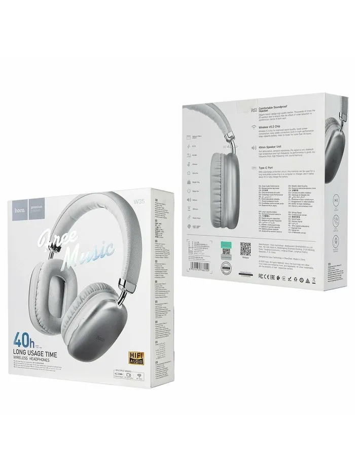Наушники беспроводные, полноразмерные, Hoco W35, Bluetooth 5.0, с шумоподавлением, с микрофоном, 400 мАч, серебристые — Характеристики
