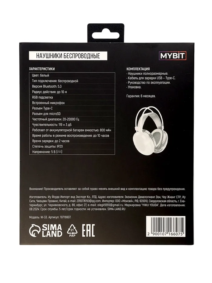 Наушники беспроводные, полноразмерные, Mybit W-33, RGB подсветка, Bluetooth 5.3, 800 мАч, Type-C, RGB подсветка, белые — Характеристики