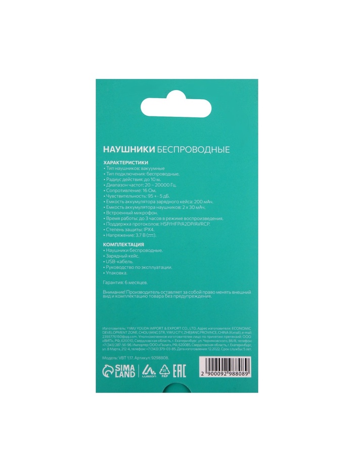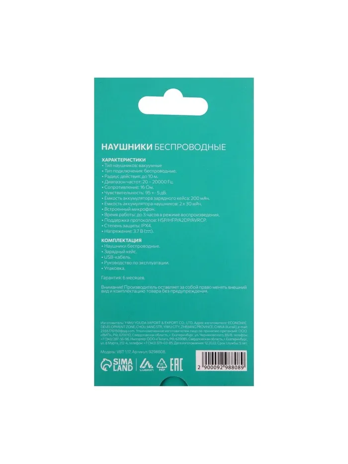 Наушники беспроводные VBT 1.17, TWS, вакуумные, Bluetooth 5.1, 30/200 мАч, подсветка, чёрные — Характеристики