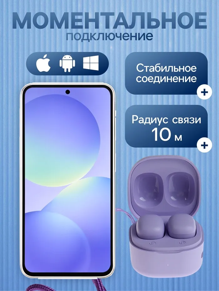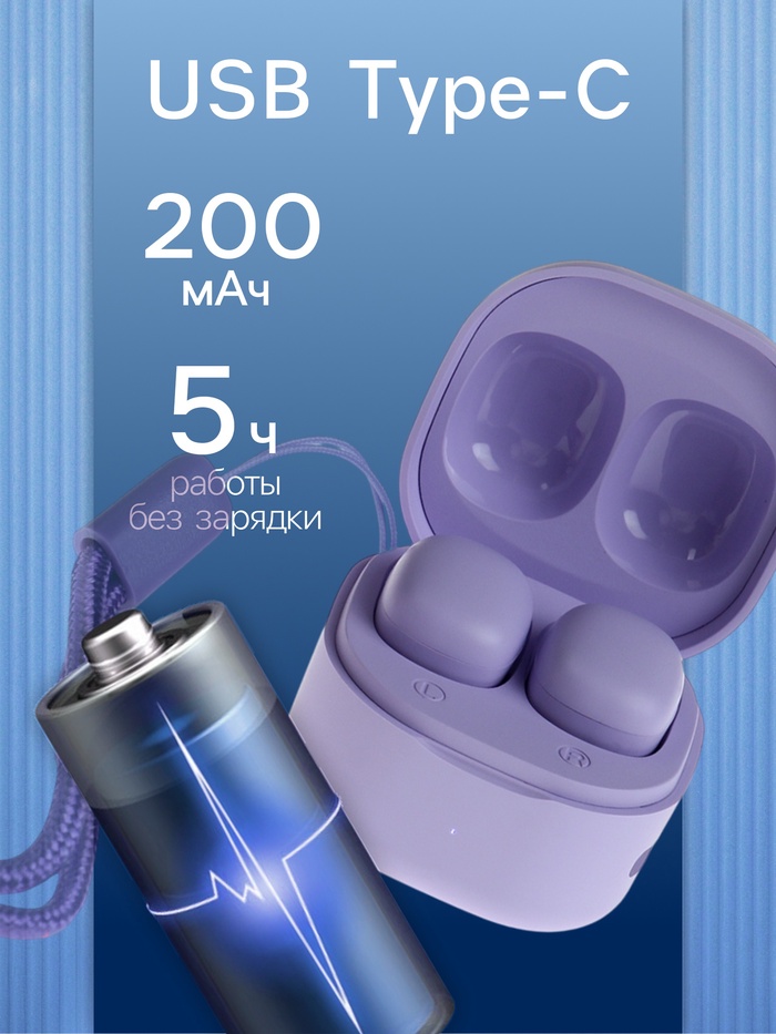 Их лаконичный фиолетовый цвет и удобная конструкция с подвесом обеспечивают комфорт даже при длительном использовании. Благодаря ёмкости аккумулятора 200 мАч, вы сможете наслаждаться музыкой или звонками до 5 часов без необходимости частой подзарядки. А современный разъём USB Type-C сделает процесс зарядки быстрым и удобным.