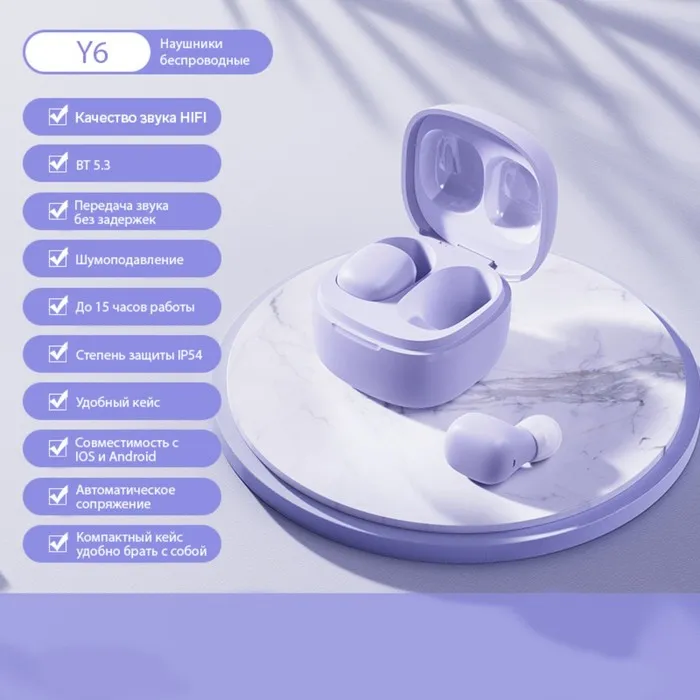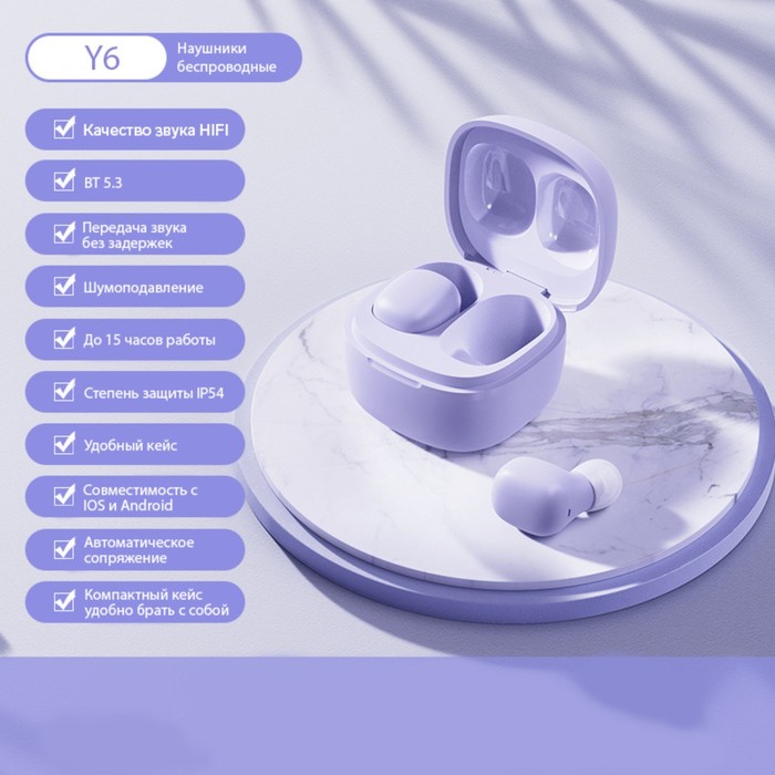 Наушники беспроводные Y6, TWS, вакуумные, Bluetooth 5.3, 30/200 мАч, шумоподавление, разъём Type-C, с подвесом, фиолетовые — Характеристики