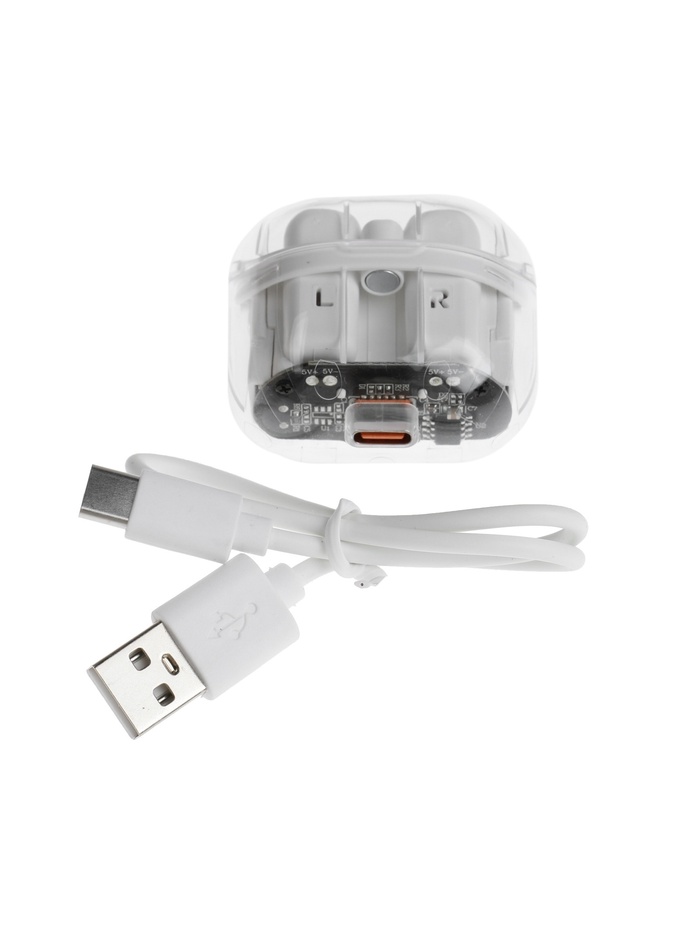 Их лаконичный белый цвет и прозрачный кейс для зарядки подчеркнут ваш стиль, а удобная конструкция обеспечит комфорт даже при длительном использовании. Благодаря ёмкости аккумулятора 300 мАч, вы сможете наслаждаться музыкой или звонками до 5 часов без необходимости частой подзарядки. А современный разъём USB Type-C сделает процесс зарядки быстрым и удобным.
