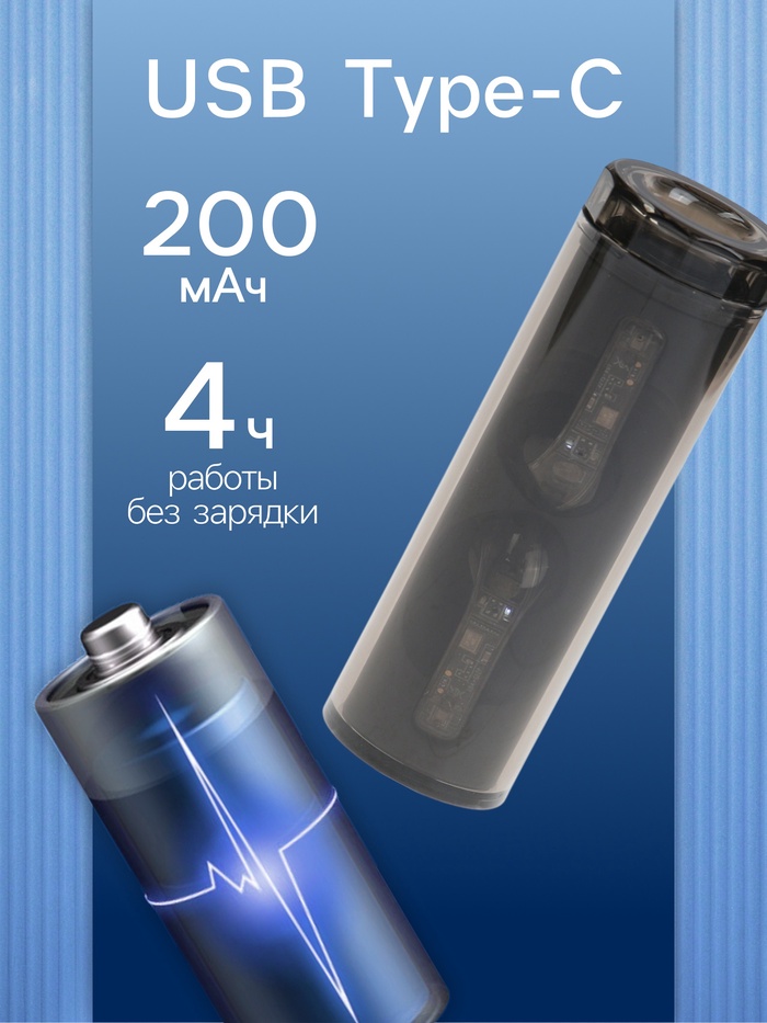 Их лаконичный чёрный цвет и прозрачный кейс для зарядки подчеркнут ваш стиль, а удобная конструкция обеспечит комфорт даже при длительном использовании. Благодаря ёмкости аккумулятора 200 мАч, вы сможете наслаждаться музыкой или звонками до 6 часов без необходимости частой подзарядки. А современный разъём USB Type-C сделает процесс зарядки быстрым и удобным.