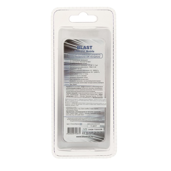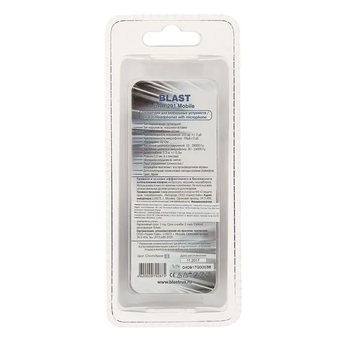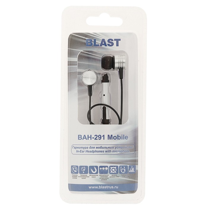 Наушники BLAST BAH-291, вакуумные, микрофон, 103 дБ, 32 Ом, 3.5 мм, 1.2 м, цвет хром — Характеристики