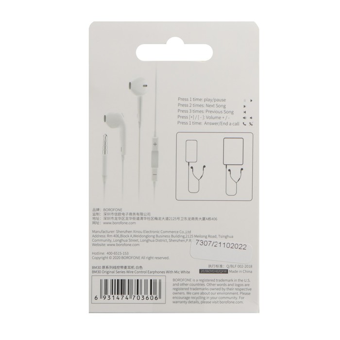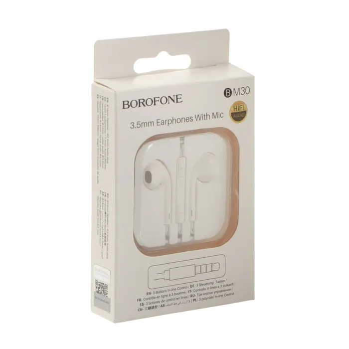 Наушники Borofone BM30, вкладыши, микрофон, Jack 3.5 мм, кабель 1.2 м, белые — Характеристики