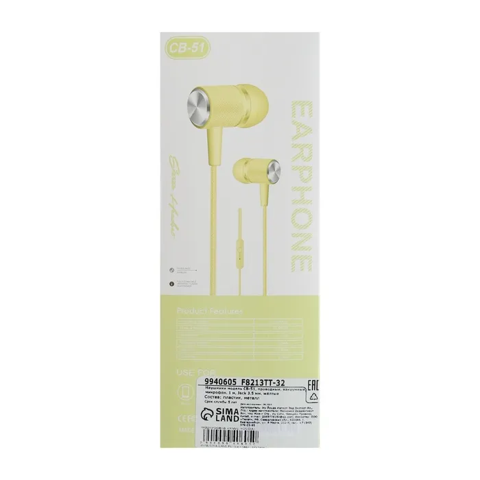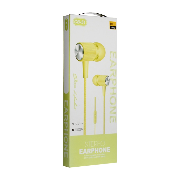 Наушники CB-51, проводные, вакуумные, микрофон, 1 м, Jack 3.5 мм, жёлтые — Характеристики