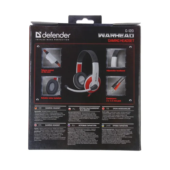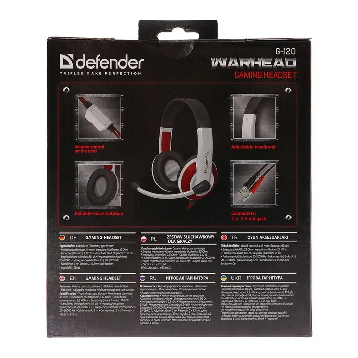 Наушники Defender Warhead G-120, игровые, полноразмерные, микрофон, 2x Jack 3.5 мм, 2 м, черно-красные — Характеристики