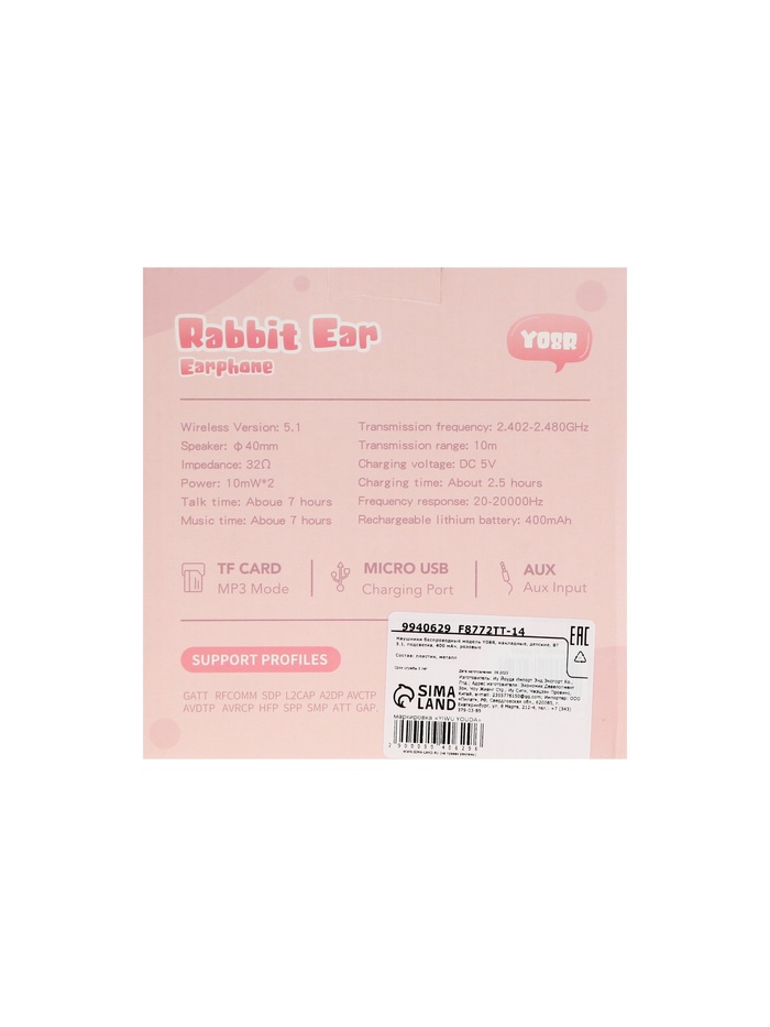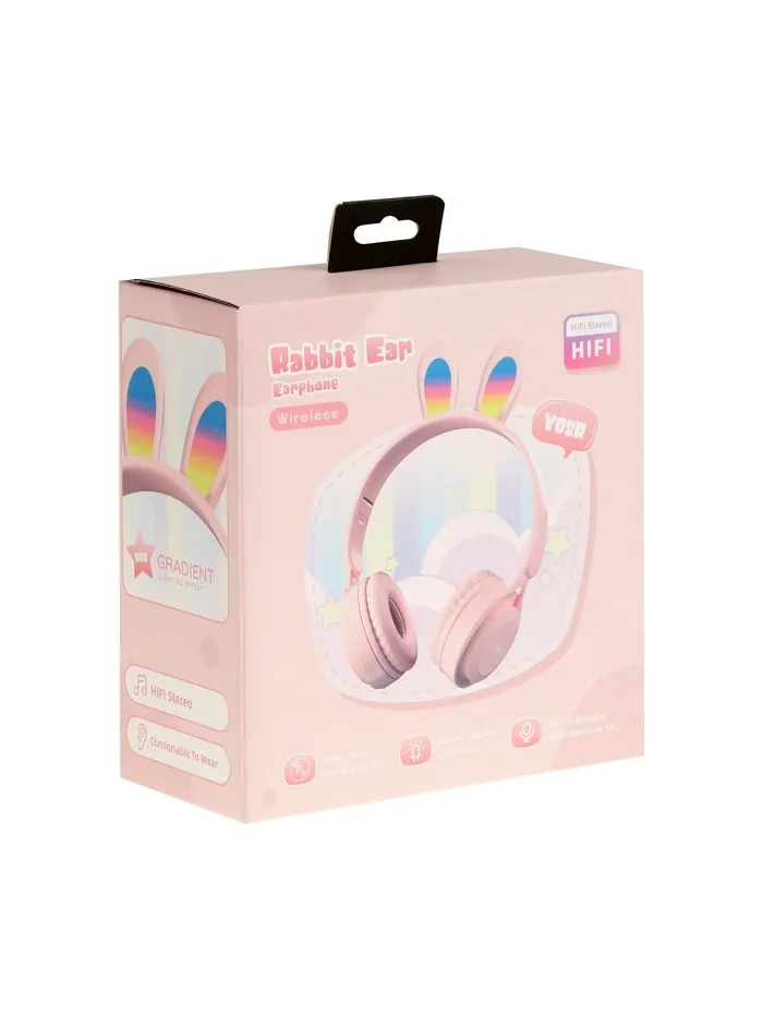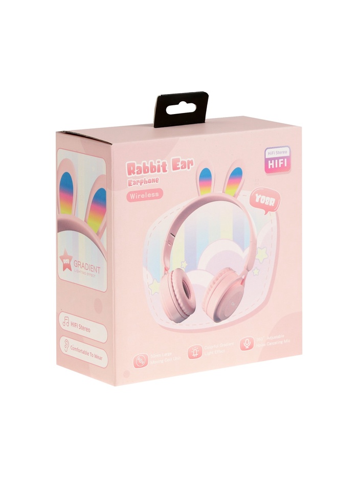 Наушники детские, беспроводные, накладные, с ушками зайца, Y08R, Bluetooth 5.1, с микрофоном, с подсветкой, 400 мАч, розовые — Характеристики