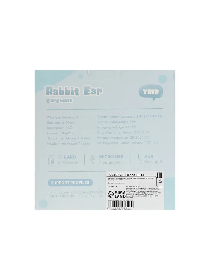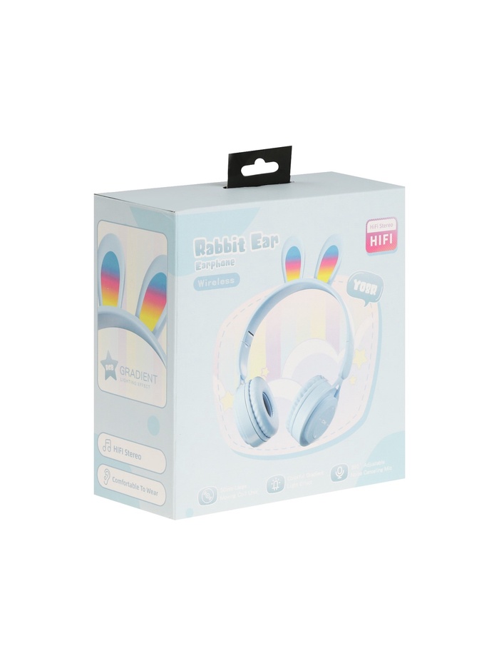Наушники детские, беспроводные, накладные, с ушками зайца, Y08R, Bluetooth 5.1, с микрофоном, с подсветкой, 400 мАч, синий — Характеристики