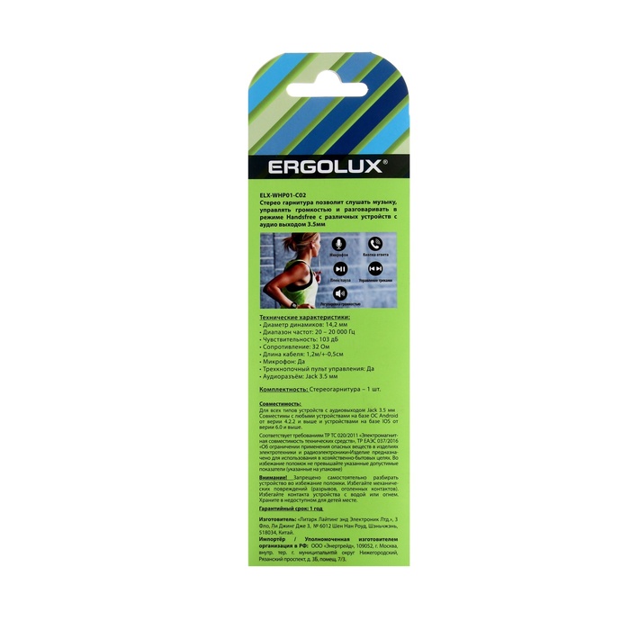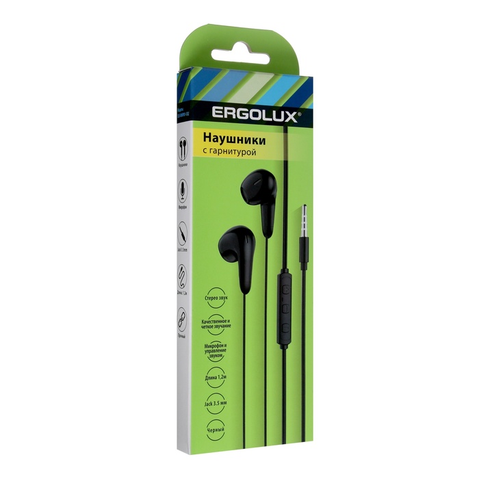 Наушники ERGOLUX ELX-WHP01-C01, проводные, вкладыши, микрофон, Jack 3.5 мм, кабель 1 м, чёрные — Характеристики