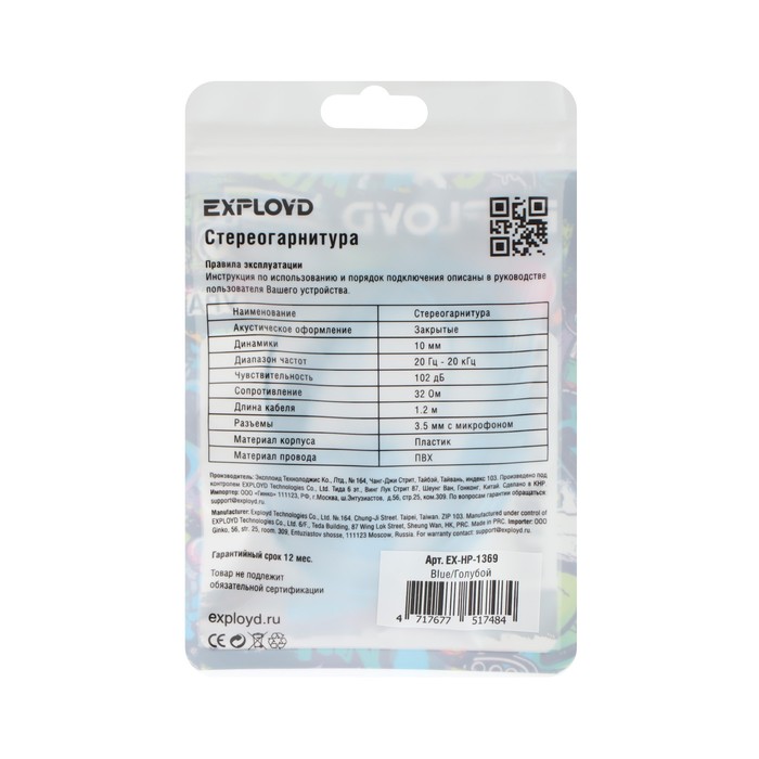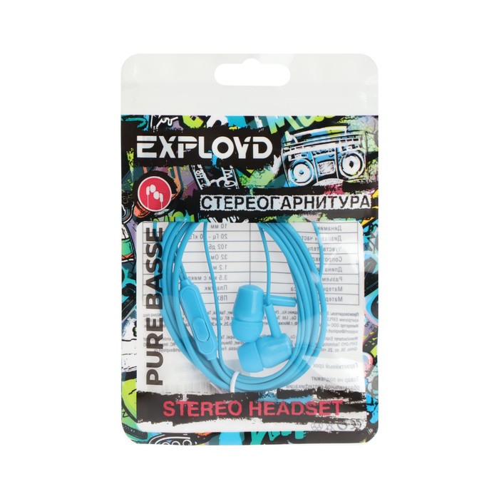 Наушники Exployd EX-HP-1369, вакуумные, микрофон, 102 дБ, 32 Ом, 3.5 мм, 1.2 м, голубые — Характеристики