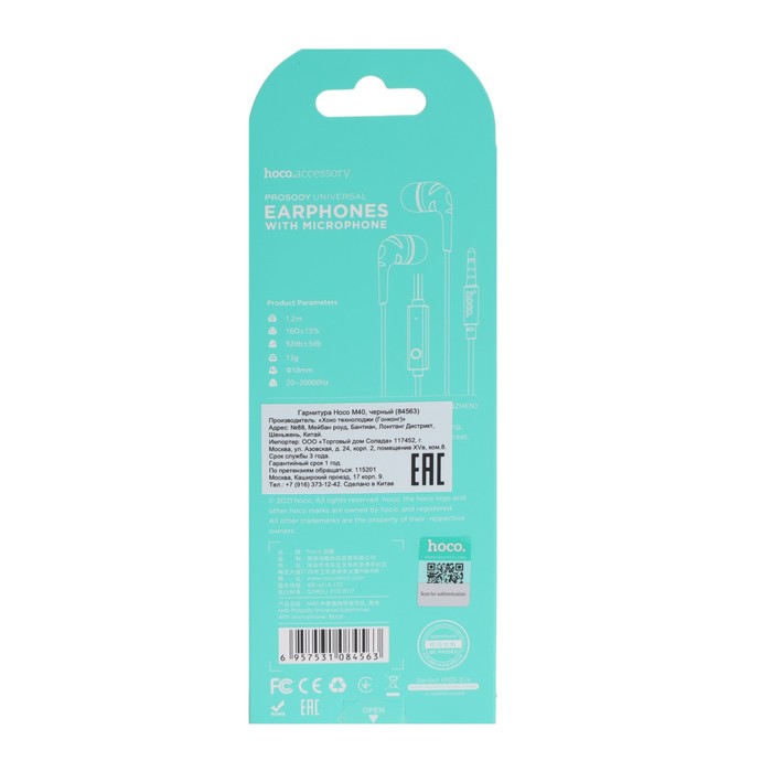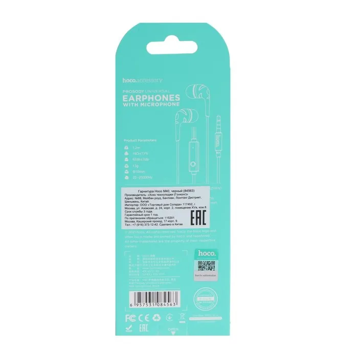 Наушники Hoco M40, проводные, вакуумные, микрофон, Jack 3.5 мм, 1.2 м, черные — Характеристики