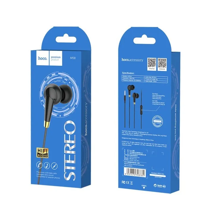 Наушники Hoco M58, проводные, вакуумные, микрофон, 1.2 м, чёрные — Характеристики