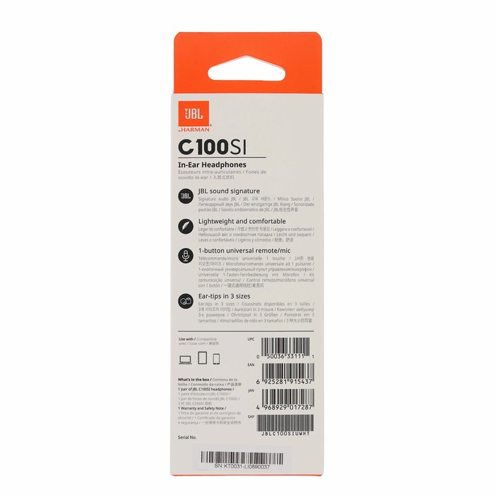 Наушники JBL C100SI, вакуумные, микрофон, 100 дБ, 16 Ом, 3.5 мм, 1.2 м, белые — Характеристики