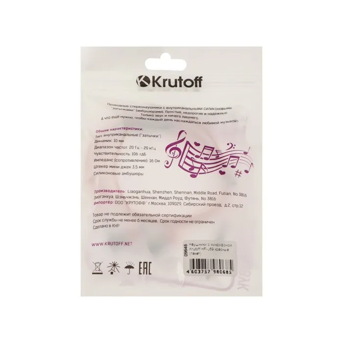 Наушники Krutoff HF-J69, вакуумные, микрофон, 106 дБ, 16 Ом, 3.5 мм, 1 м, красные — Характеристики