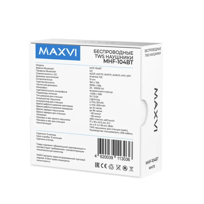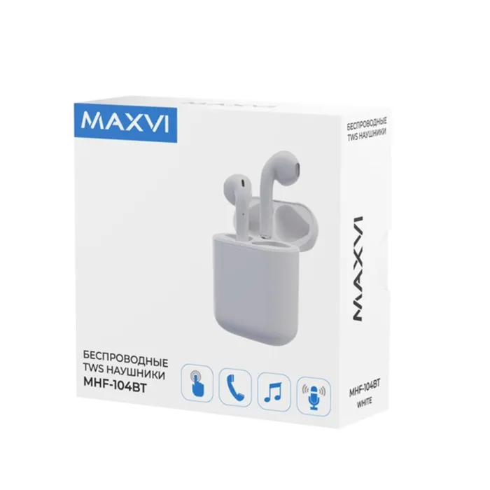 Наушники Maxvi MHF-104BT, вкладыши, сенсорное управление, микрофон, 35/200 мАч, белые — Характеристики