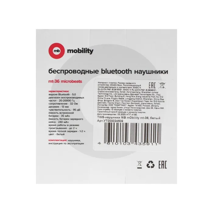 Наушники MB mObility mt-36, беспроводные, вкладыши, микрофон, белые — Характеристики