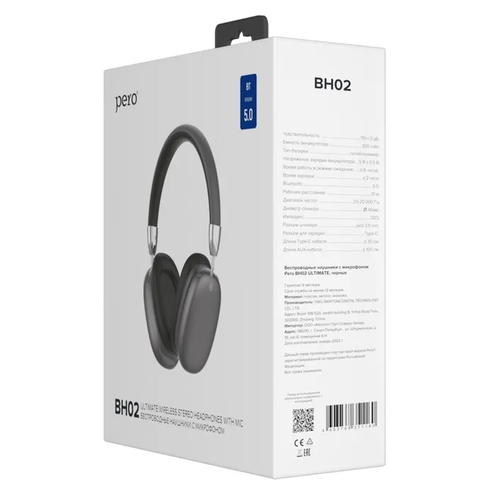 Наушники PERO BH02 ULTIMATE, беспроводные, BT 5.0, микрофон, 300 мАч, до 12 часов, черные — Характеристики
