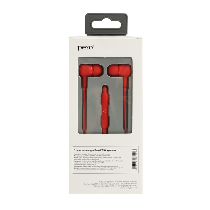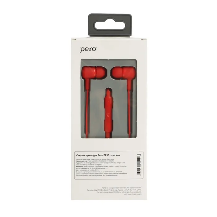 Наушники PERO EP16, вакуумные, 98 дБ, 24 Ом, 3.5 мм, 1.1 м, красные — Характеристики