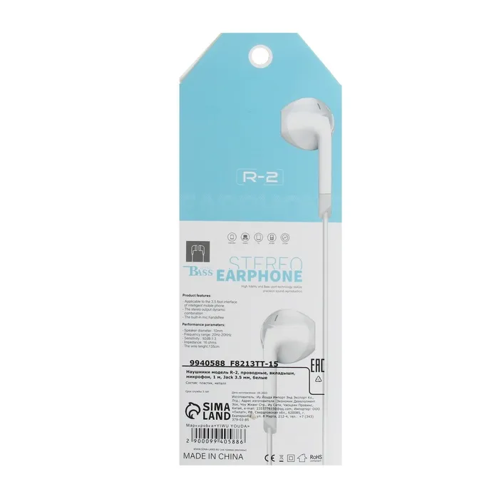 Наушники R-2, проводные, вкладыши, микрофон, 1 м, Jack 3.5 мм, белые — Характеристики
