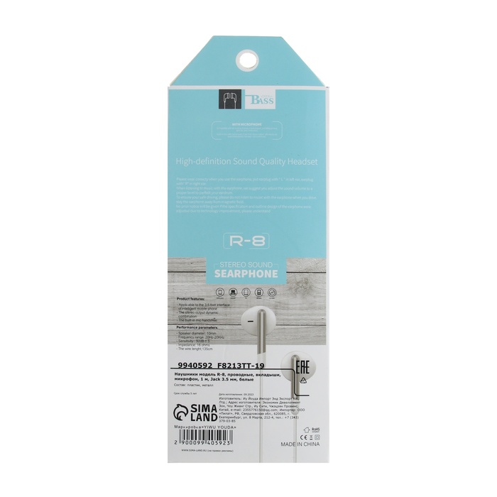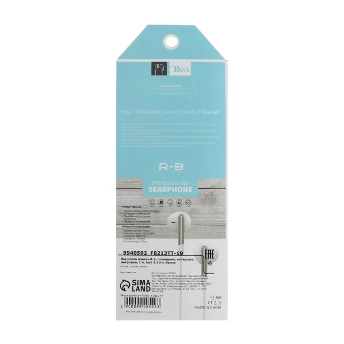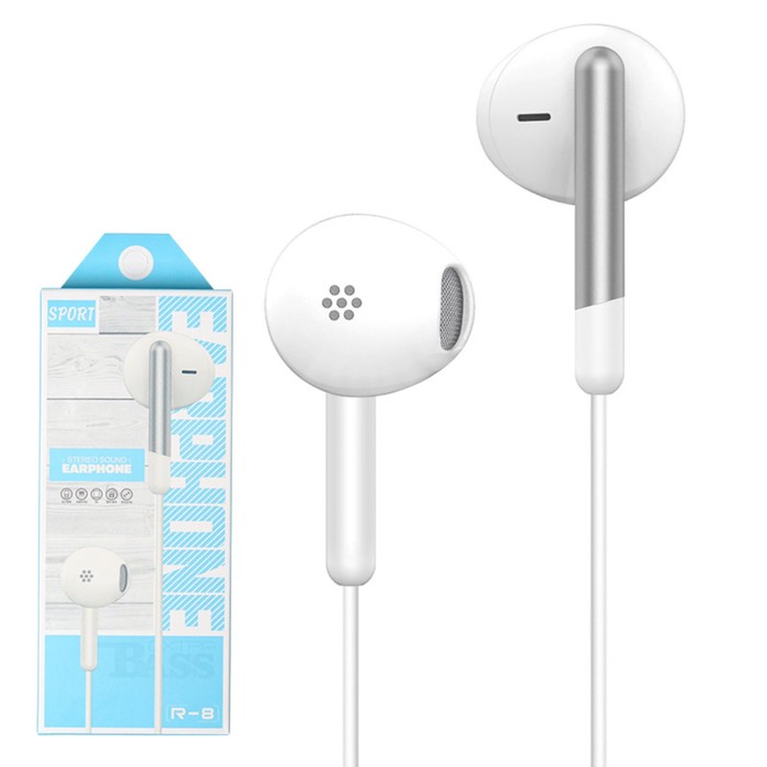 Наушники R-8, проводные, вкладыши, микрофон, 1 м, Jack 3.5 мм, белые — Характеристики