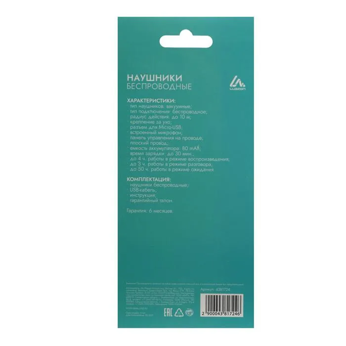 Наушники спортивные беспроводные, Luazon VBT 1.12, вакуумные, Bluetooth 4.1, с микрофоном, 80 мАч, чёрно-синие — Характеристики