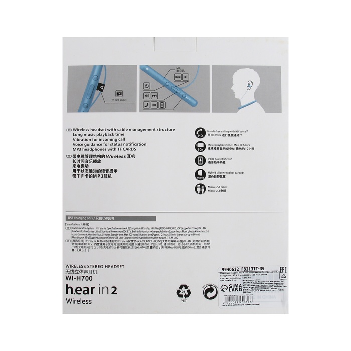 Наушники спортивные беспроводные, WI-H700, вакуумные, Bluetooth 4.2, с микрофоном, 100 мАч, синие — Характеристики