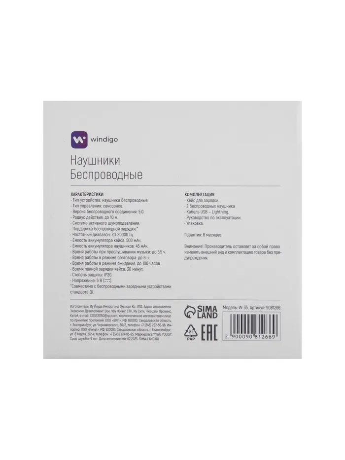 Наушники TWS беспроводные, Windigo Pro 2, вакуумные, Bluetooth 5.0, 45/500 мАч, с шумоподавлением, белые — Характеристики