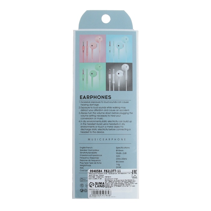 Наушники U19, проводные, вкладыши, 1 м, Jack 3.5 мм, синие — Характеристики