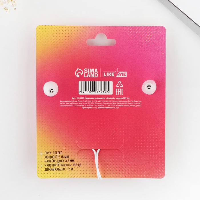 Наушники вакуумные, «Блистай», мод. OBT 1.6, 120 см