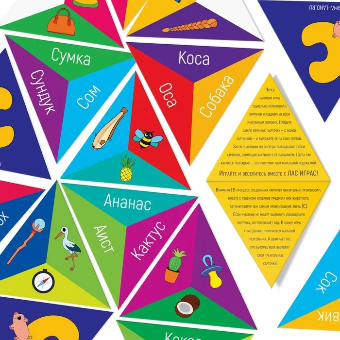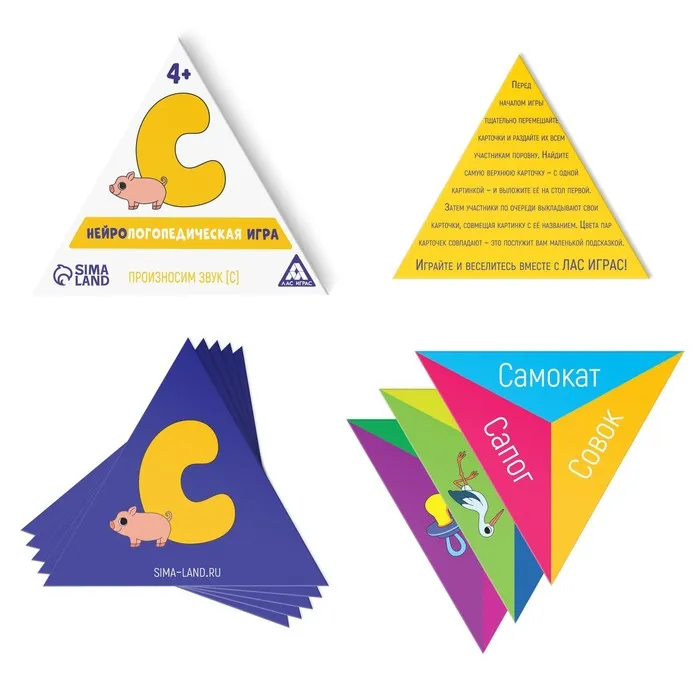 В процессе соединения карточек обязательно произносите вместе с ребёнком название предмета или животного, автоматизируя тем самым произношение звука [С]. Если участник не может выложить подходящую карточку, он пропускает ход. К концу игры у вас должен получиться большой треугольник. А выиграет тот, кто быстрее всех выложит свои треугольные карточки!