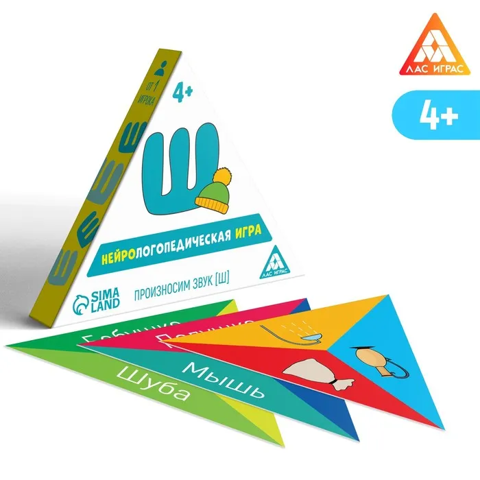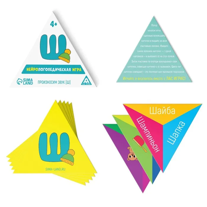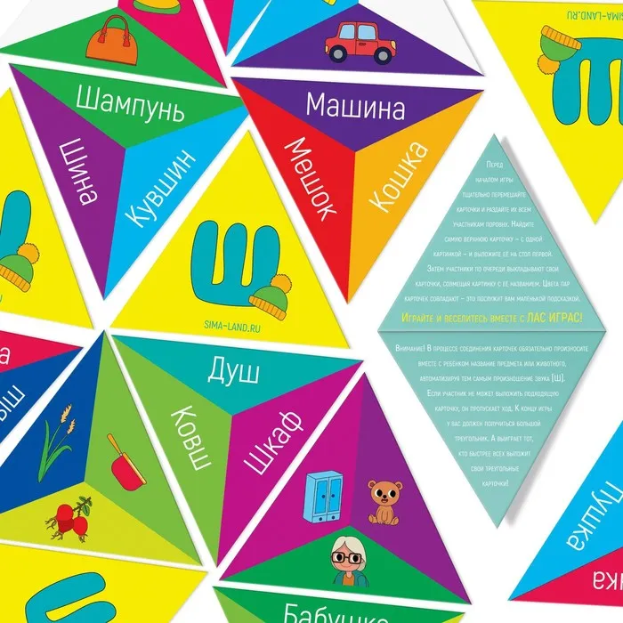 В процессе соединения карточек обязательно произносите вместе с ребёнком название предмета или животного, автоматизируя тем самым произношение звука [Ш]. Если участник не может выложить подходящую карточку, он пропускает ход. К концу игры у вас должен получиться большой треугольник. А выиграет тот, кто быстрее всех выложит свои треугольные карточки!