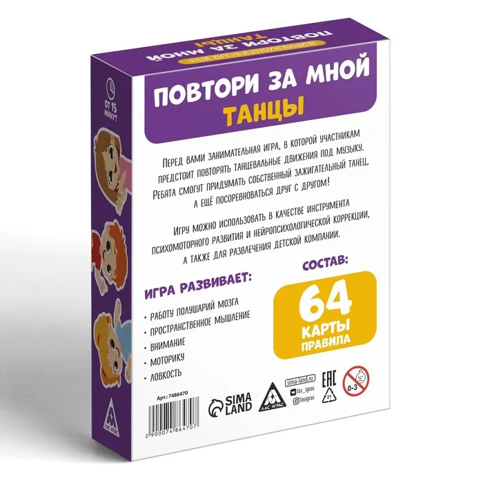 Перед вами занимательная игра, в которой участникам предстоит повторять движения под музыку. Игроки придумают собственный зажигательный танец и посоревнуются друг с другом! Игру можно использовать в качестве инструмента психомоторного развития и нейропсихологической коррекции, а также просто для развлечения детской компании.