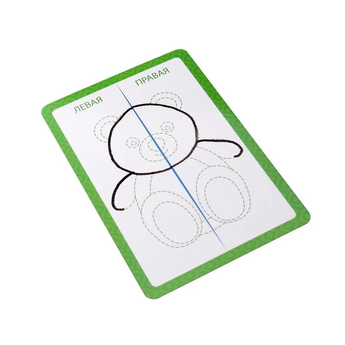 На другой стороне карт ребёнку необходимо, не отрывая маркеры от карточки, провести линии обеими руками. Это поможет синхронизировать работу обоих полушарий мозга. Все карточки многоразовые. Стереть рисунок легко с помощью сухой салфетки или обратной стороной маркера.
