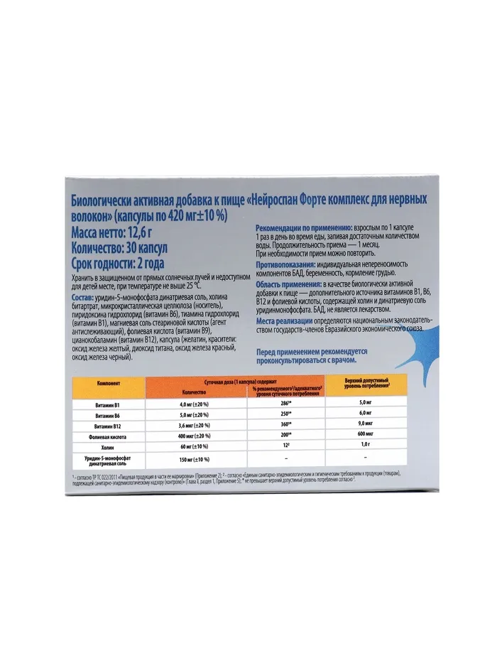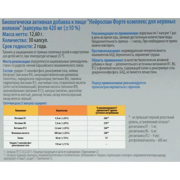 Нейроспан Форте комплекс - расширенная формула «Нейроспан комплекс для нервных волокон», так как в его состав добавлены холин, витамины В1 и В6, оказывающие положительное влияние на метаболизм нервных клеток и формирование связей между ними, что ведет к ускоренному восстановлению и нормализации работы центральной нервной системы.