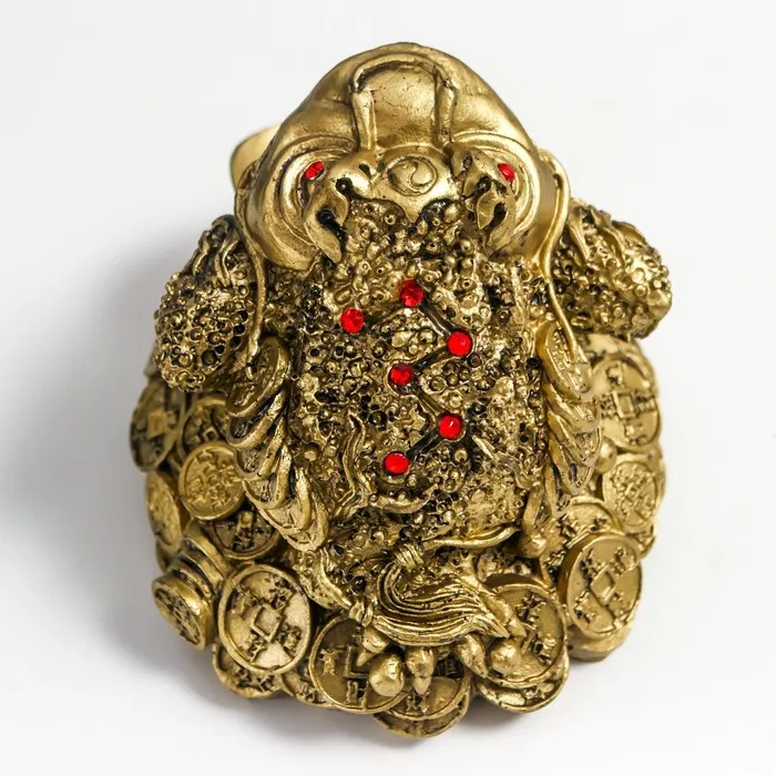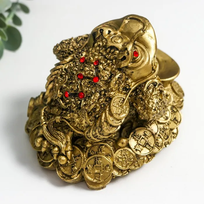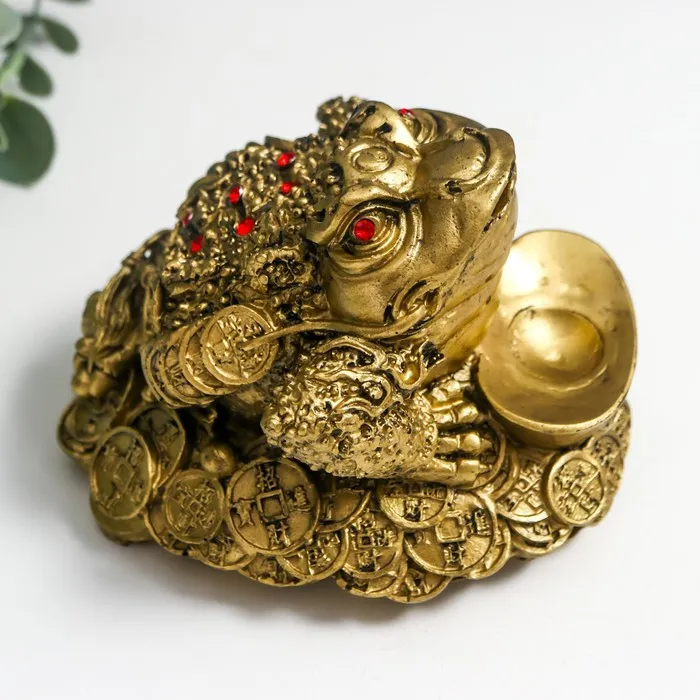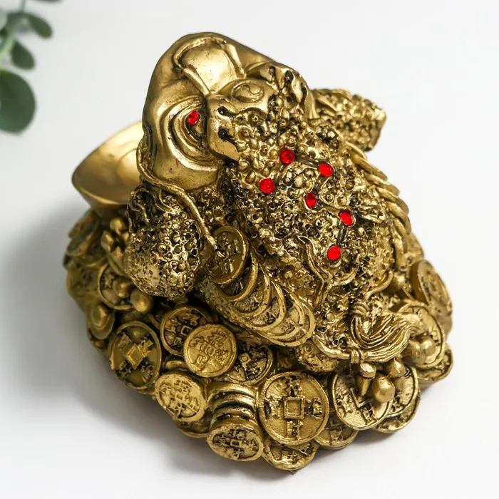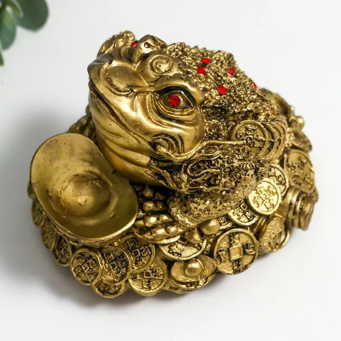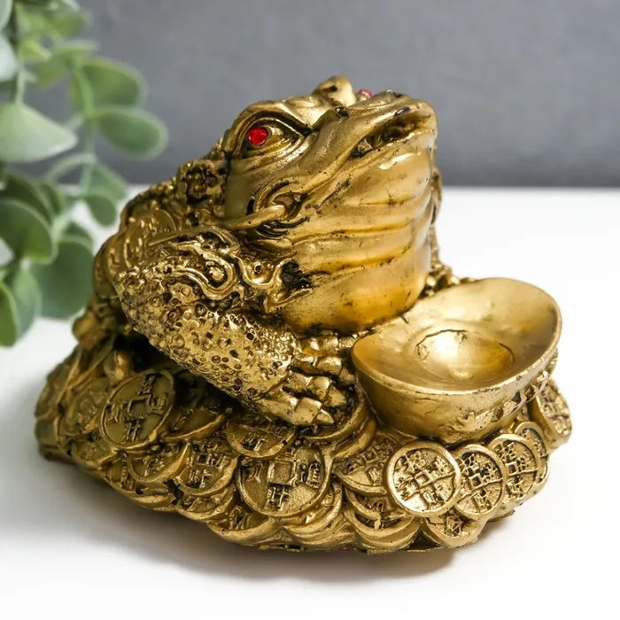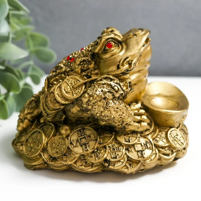 Нэцкэ фигурка «Денежная жаба на монетах и золотых слитках», полистоун, под бронзу, 7.5×9×11 см — Характеристики