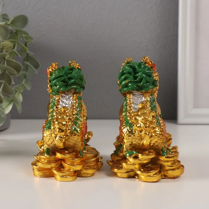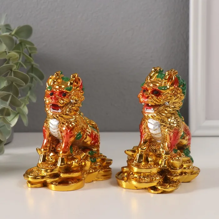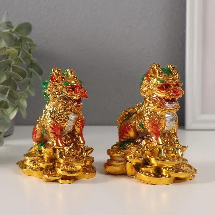 Нэцкэ фигурка «Кирины на монетах», полистоун, золотой, набор 2 шт., 6×9×10.5 см — Характеристики