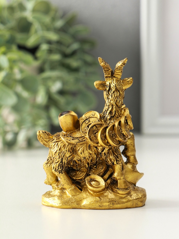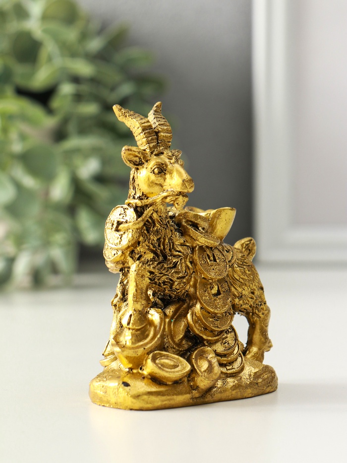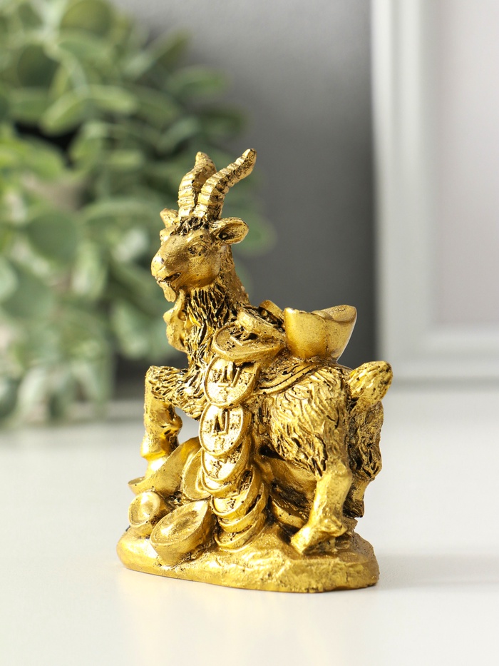 Нэцкэ фигурка полистоун «Козёл с китайскими монетами и золотыми слитками», под бронзу, 4.2×7×9.4 см — Характеристики