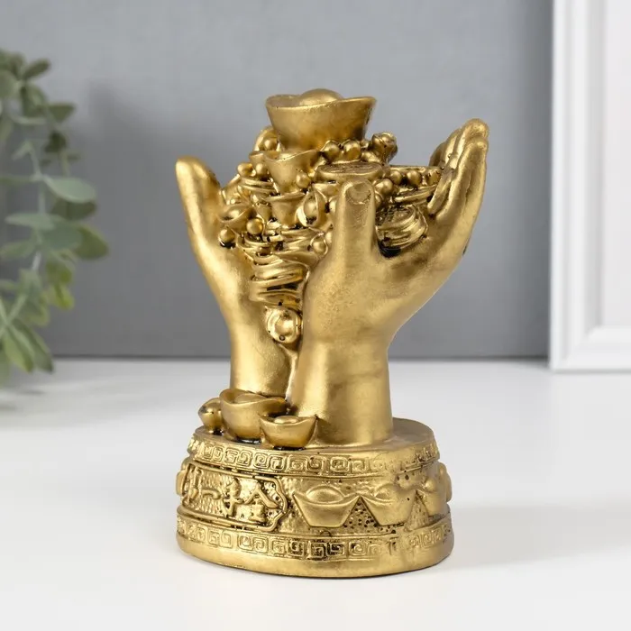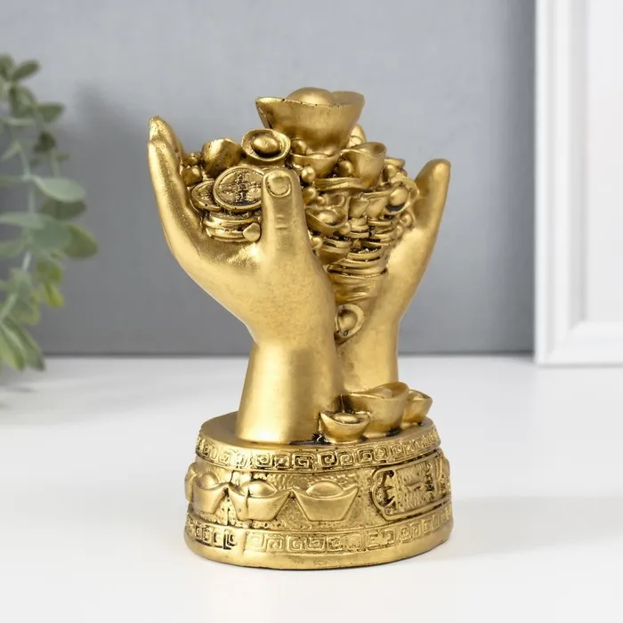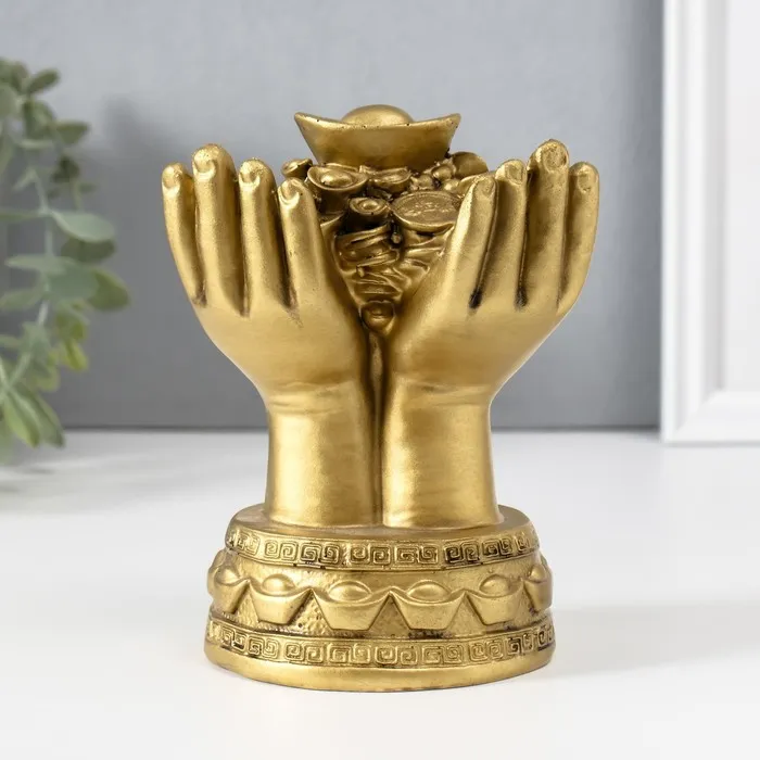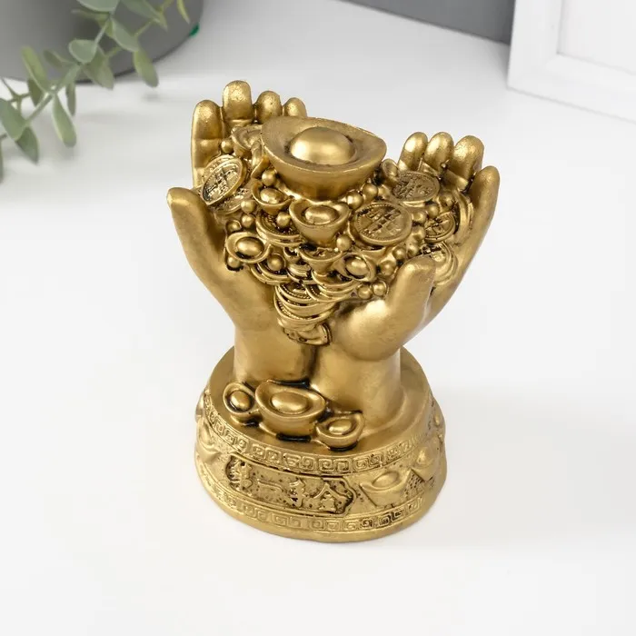 Нэцкэ полистоун под бронзу "Монеты и слитки в ладонях" 7,7х10,7х14 см — Характеристики